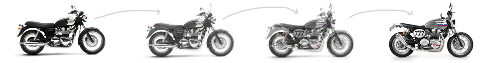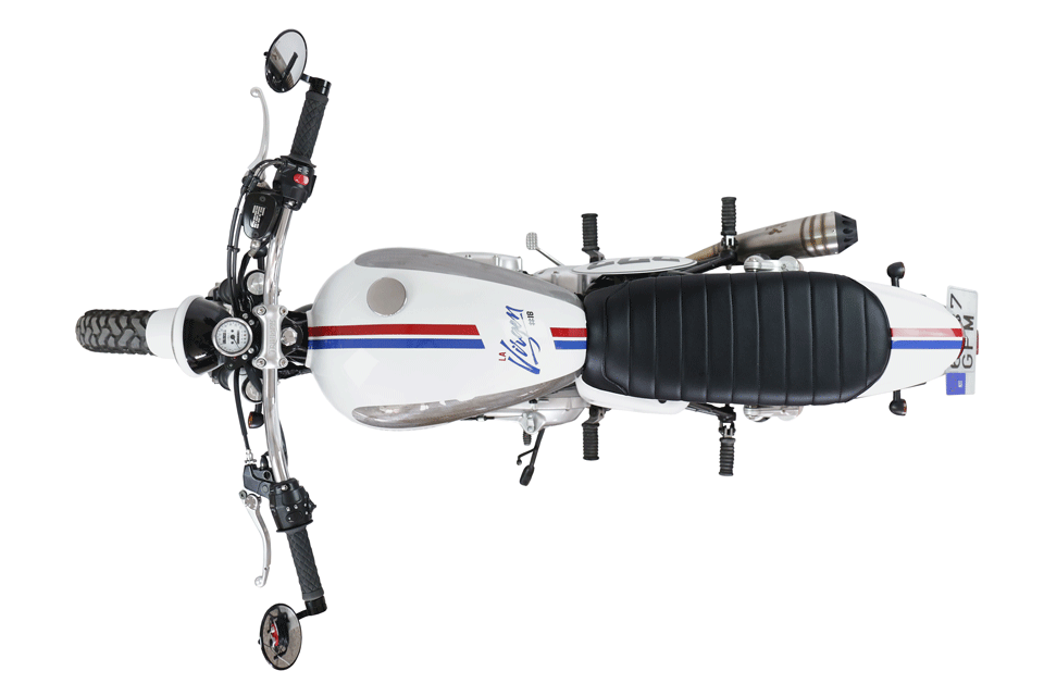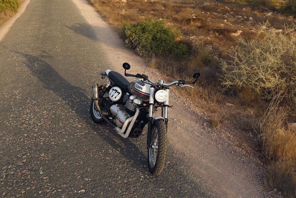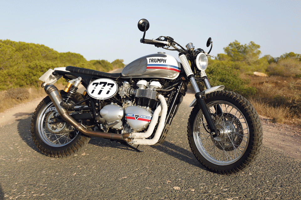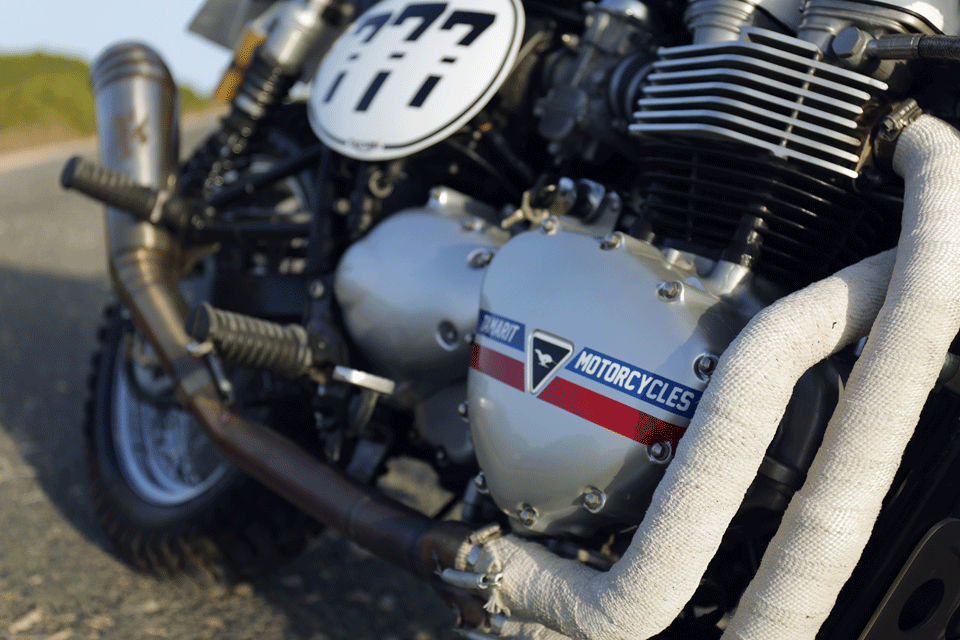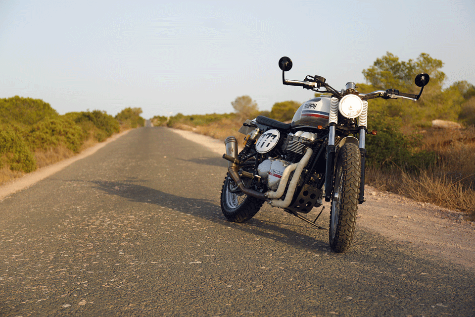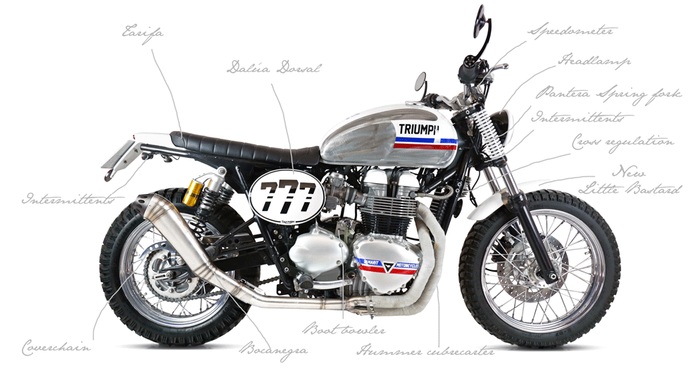 Triumph parts - Tamarit Motorcycles: Engine protection "Super López", Protective lower chain guard, fist mirrors, suspension shock springs "Pantera", Öhlins rear shock absorbers, Front fender "New little bastard", Santa María side cover, Number plates customized "Dalua", Regulator relocation bracket, fixation bracket cylinder, Front Turn signals, rear turn singnal and relocation brackets,