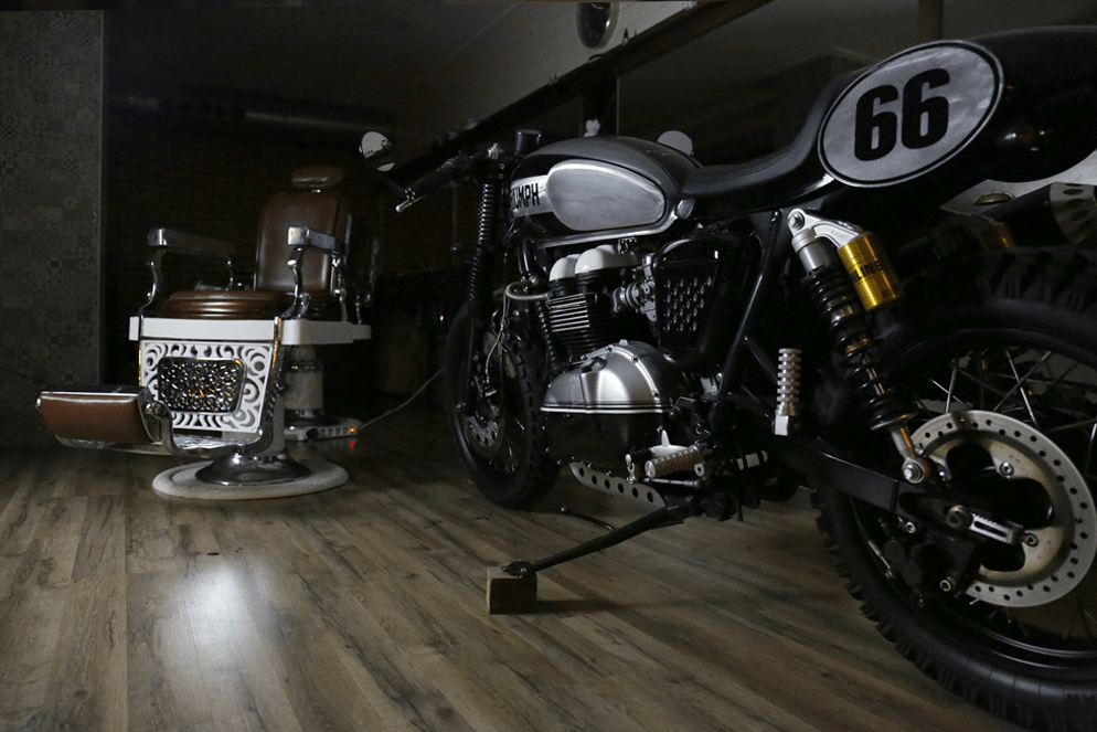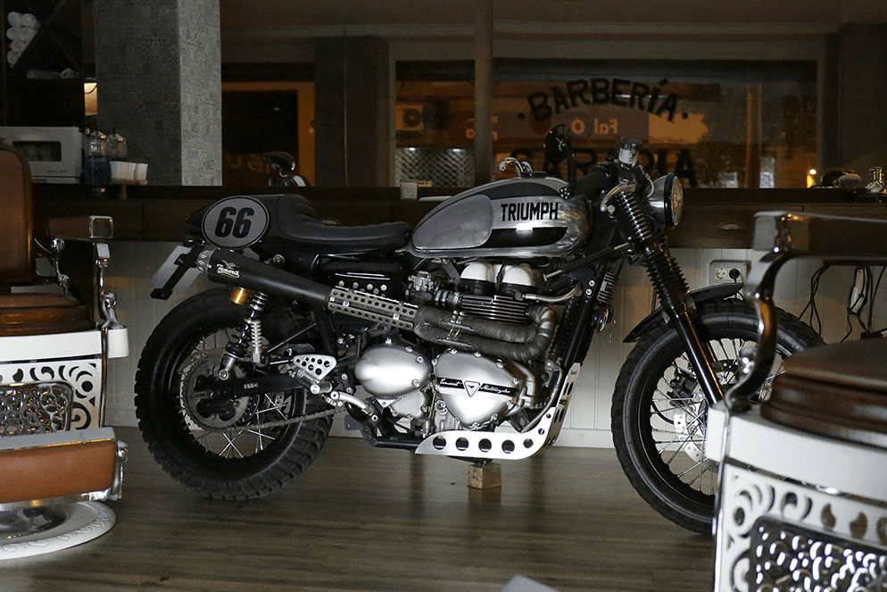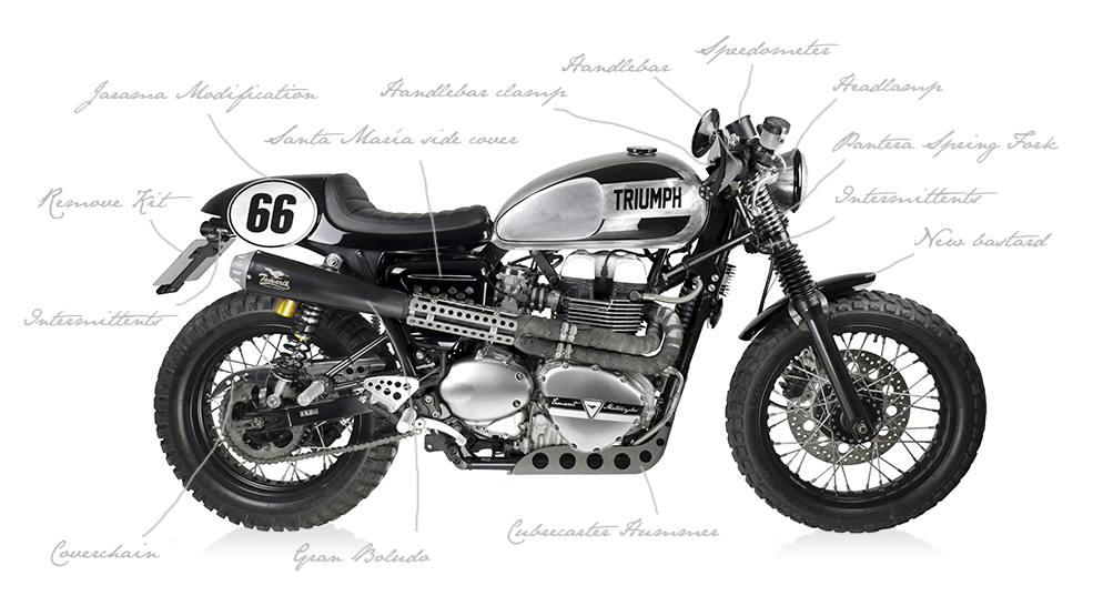 Triumph parts - Tamarit Motorcycles: Protective lower chain guard, Rear fender eliminator, Santa María side cover, Engine protection "Hummer", Front Turn signals, rear turn singnal and relocation brackets, suspension shock springs "Pantera", fist mirrors, and Öhlins shock absorbers.
