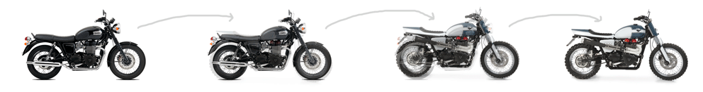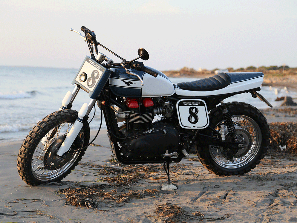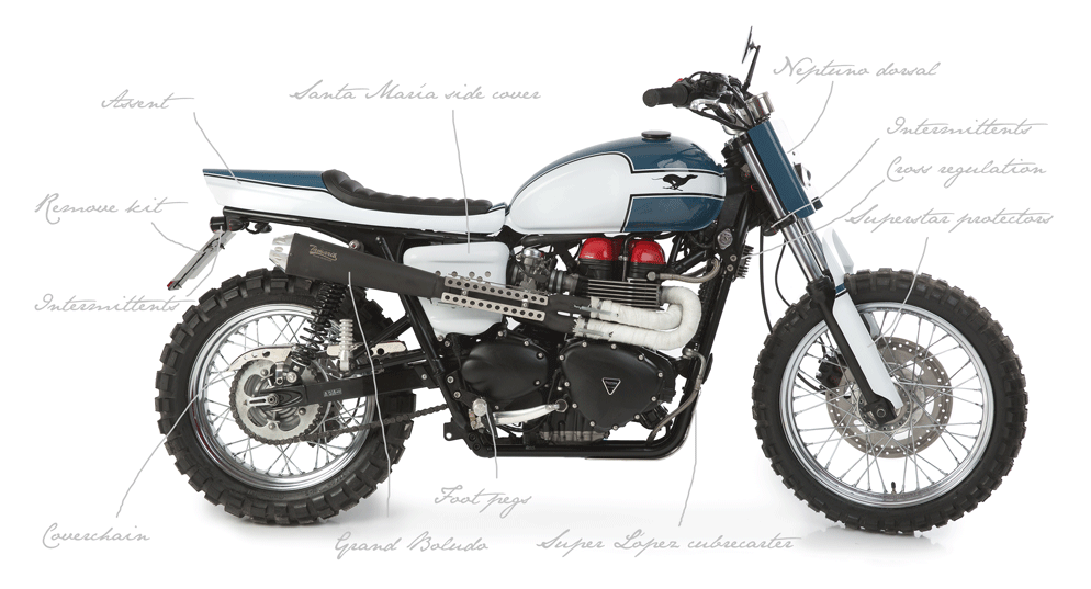 Triumph parts - Tamarit Motorcycles: Super López cubrecarter, coverchain, footrests, remove kit, Santa María side cover, Superstar protectors, Moto Veloz dorsal, Hagon shock absorbers, intermittents and rear intermittents