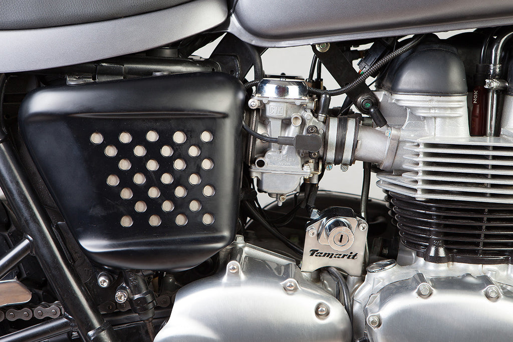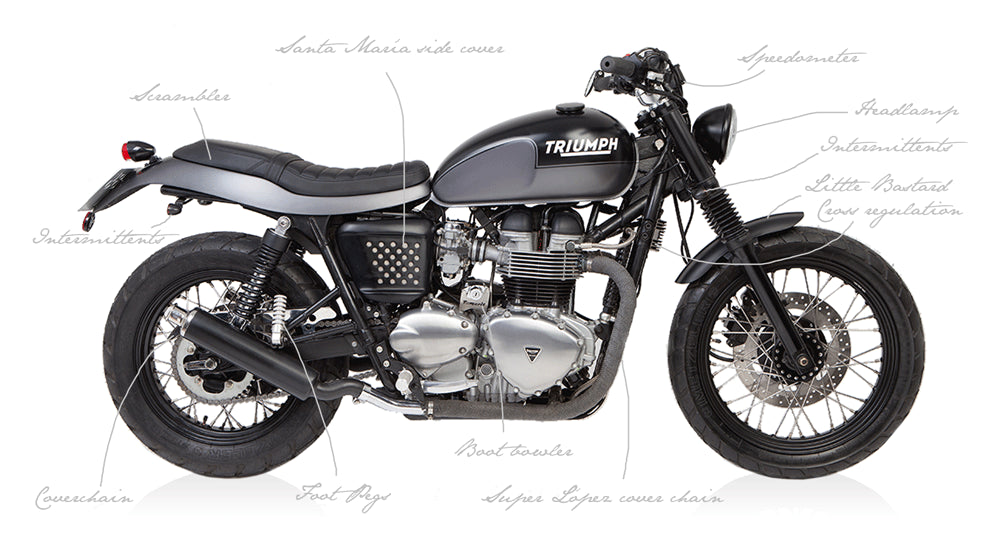 Triumph parts - Tamarit Motorcycles: Super López cubrecarter, coverchain, footrests, Santa María side covers, little bastard, intermittents and rear intermittents
