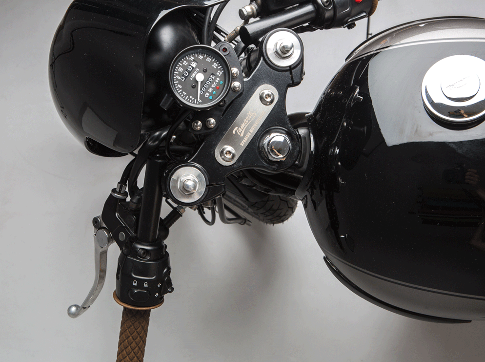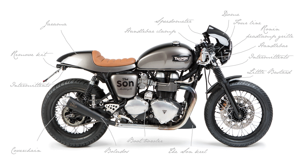 Triumph parts - Tamarit Motorcycles: The Son keel, coverchain, four line, Mr.Kevin dome, remove kit, little bastard, Ronin headlamp grille, amortiguadores Hagon shock absorbers, handlebar clamp, boot bowler, intermittents and rear intermittents.