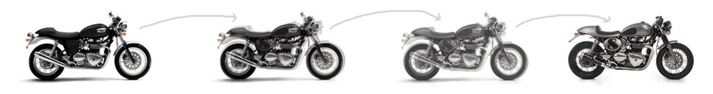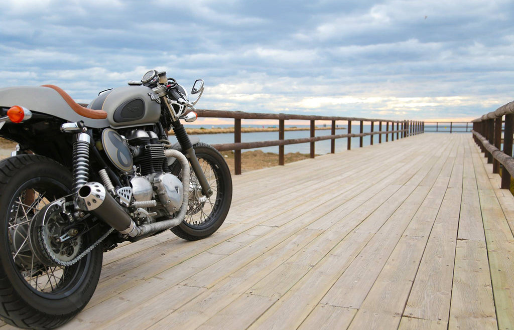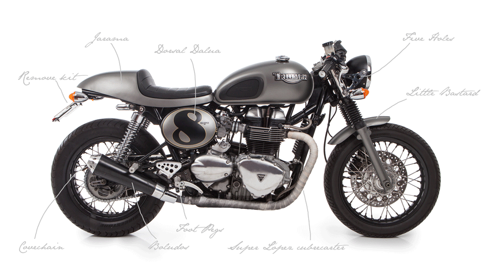 Triumph parts - Tamarit Motorcycles: Super López cubrecarter, coverchain, footrests, five holes, remove kit, Dalua dorsal, Little Bastard and relocation original mirrors.