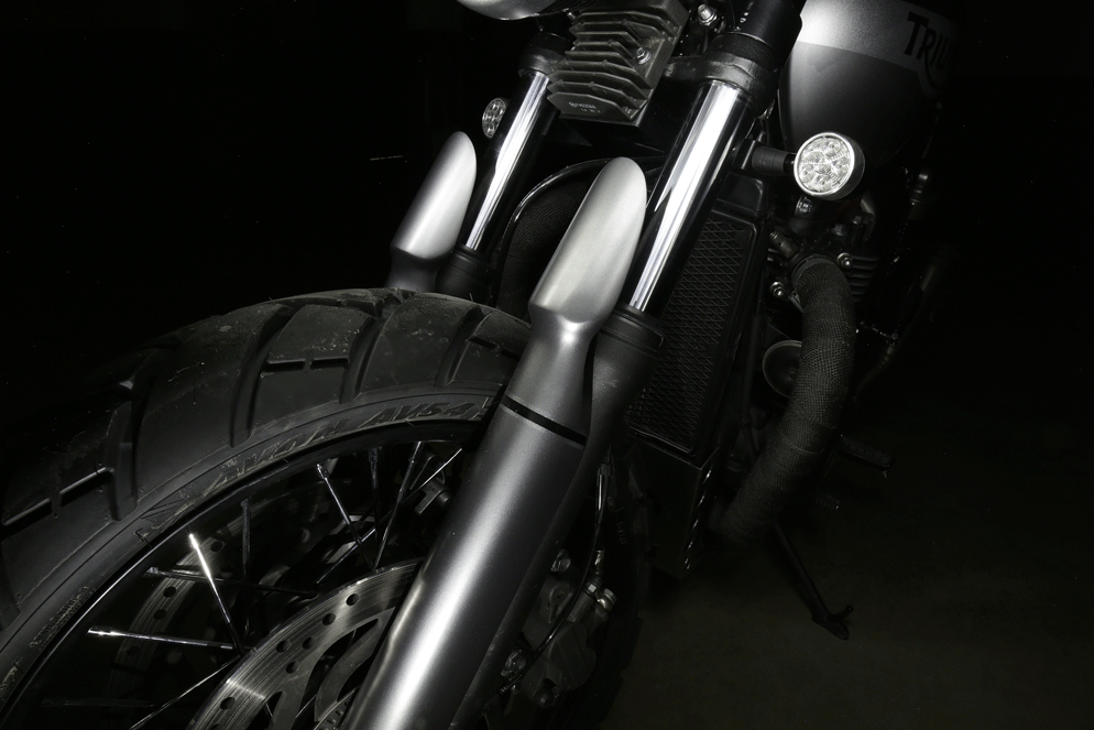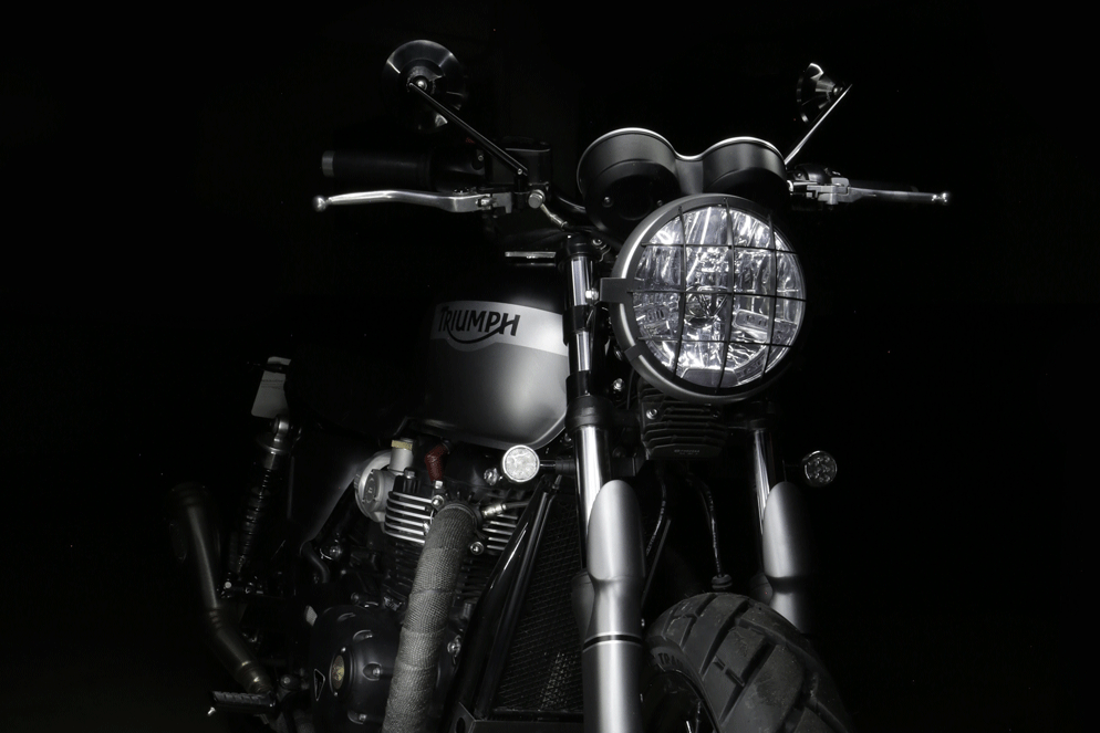 Triumph parts - Tamarit Motorcycles: side cover Triumph, engine protection Yunque, headlight bracket "Four Line", Grille Muralla, Triumph front turn signal , relocation brackets, Triumph rear turn signal, Round mirror, and Triumph Fork Protectors.